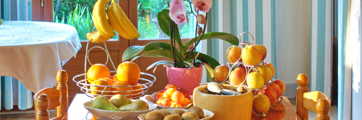 Home-made conserves, muesli, cereal flakes, dried fruits, natural yogurt (also prepared on the premises) and flavoured yoghurts are provided as well as a generous selection of seasonal fresh fruits and walnuts.
